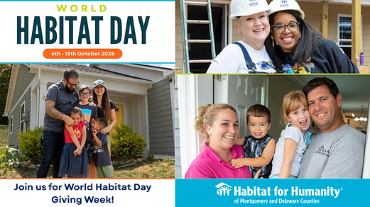 Everyone deserves a place to call home. This World Habitat Day, celebrated on Monday, October 6th, we’re launching Giving Week with a mission goal: raise $10,000 by October 13th to support individuals and families in Montgomery and Delaware Counties working toward safe, affordable housing.